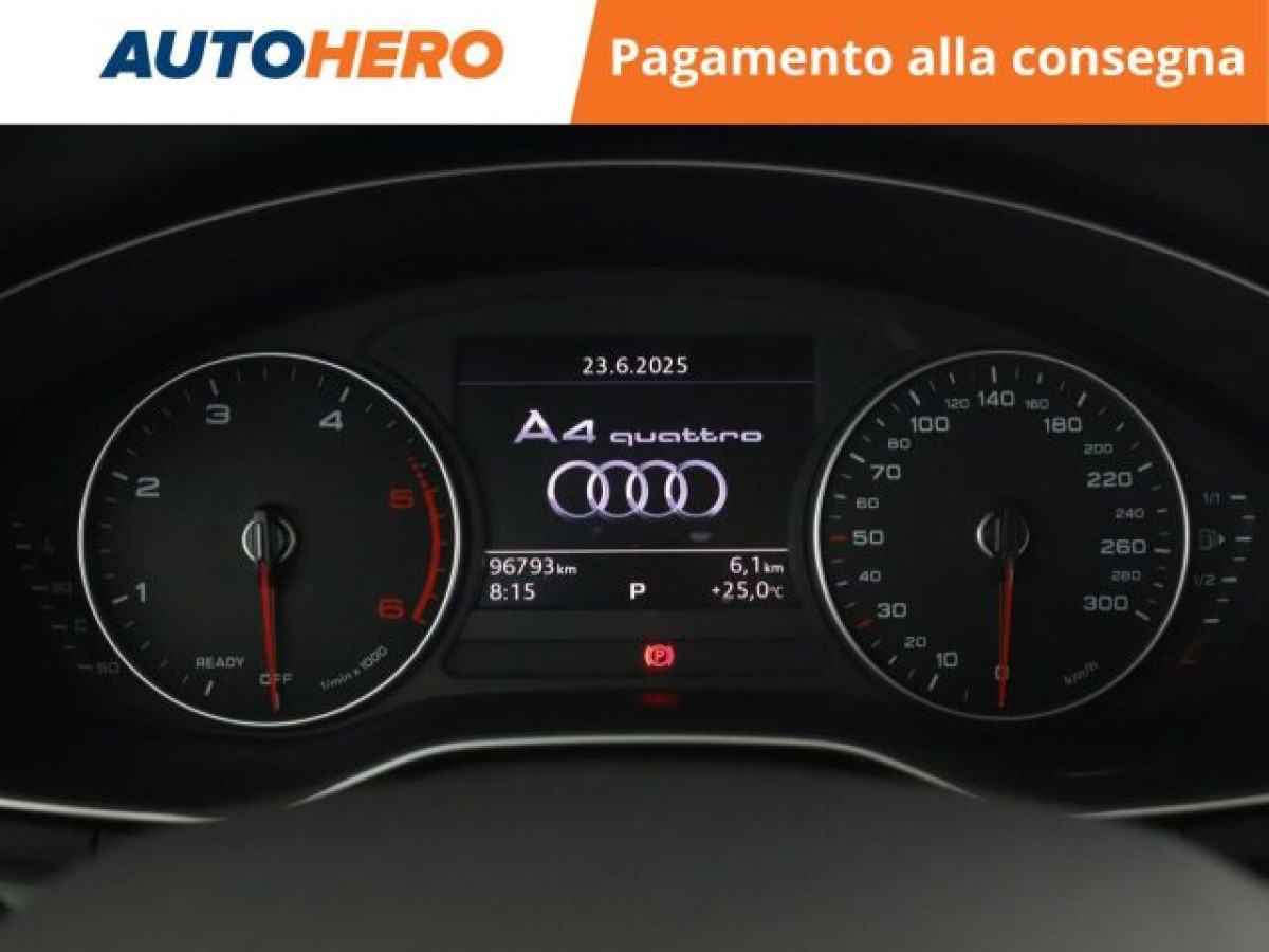 Sound system, Bluetooth, Filtro antiparticolato, Vivavoce, Isofix, MP3, USB, Luci diurne, Controllo vocale, Start/Stop Automatico, Sensori di parcheggio anteriori, Sensore di pioggia, Sensore di luce, Sensori di parcheggio posteriori, Specchietti laterali elettrici, Chiusura centralizzata senza chiave, Bracciolo, Leve al volante, Airbag testa, Sedile posteriore sdoppiato, Freno di stazionamento elettrico, Limitatore di velocità, Specchietto retrovisore con funzione ant. PAGAMENTO ALLA CONSEGNA, RESO GRATUITO E 1 ANNO DI GARANZIA: SOLO SU AUTOHERO! _________________________________________ SEMPRE INCLUSO: - Pagamento alla consegna, prima vedi poi paghi - Reso gratuito, avrai 21 giorni e 500 km per cambiare idea - Finanziamento flessibile**, personalizzabile senza vincoli - Standard di qualità, veicoli ricondizionati e sanificati - Semplicità nell\'acquisto, gestiamo noi tutte le pratiche - Acquisto sicuro, più di 1000 feedback positivi su Trustpilot - Garanzia 12 mesi inclusa, estendibile fino a 36 mesi _________________________________________ SALIAMO A BORDO! Tra le nostre Audi A4, questa si presenta nell allestimento 190 CV S tronic quattroImmatricolata a dicembre 2018, si presenta in perfette condizioni. Nella motorizzazione 2.0 TDI avrai tutta la potenza necessaria per affrontare ogni situazione. L alimentazione Diesel è ancora la soluzione migliore per gli spostamenti più lunghi e per garantire maggiore vita al tuo motore, grazie anche al cambio automatico. Infine, la vita a bordo sarà più facile grazie a Alzacristalli elettrici, Autoradio e Chiusura centralizzata. Che aspetti? Visita il nostro sito per scoprire tutti i dettagli e la sua storia! _________________________________________ CONTATTACI SUBITO: - Telefonicamente al numero indicato nell\'annuncio - Tramite mail a clienti@autohero.com - Sul nostro sito www.autohero.com - Offerta N.AN65200 Annuncio completo: https://www.autohero.com/it/Link/id/66e745d0-4b7e-491a-ad7b-213a8adfd452/?utm_source=CLA&utm_medium=classifieds&utm_campaign=classifieds_IT.