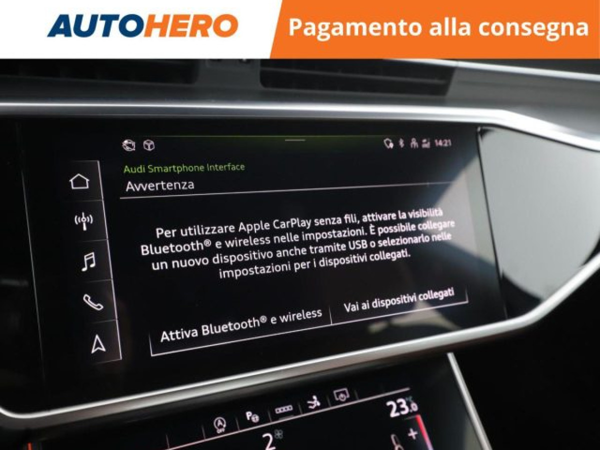 MP3, Bluetooth, Luci diurne, Isofix, Start/Stop Automatico, Sensore di luce, Telecamera per parcheggio assistito, Vivavoce, Sensori di parcheggio anteriori, Sensori di parcheggio posteriori, Sensore di pioggia, Specchietti laterali elettrici, Supporto lombare, Touch screen, USB, Controllo vocale, Portellone posteriore elettrico, Fari LED, Chiusura centralizzata senza chiave, Bracciolo, Adaptive Cruise Control, Hill holder, Luci diurne LED, Leve al volante, Airbag testa, Riconoscimento dei segnali stradali, Sedile posteriore sdoppiato, Controllo elettronico della corsia, Frenata d\'emergenza assistita, Climatizzatore automatico, 2 zone, Freno di stazionamento elettrico, Sistema di parcheggio automatico, Apple CarPlay, Schermo multifunzione interamente digita, Specchietto retrovisore con funzione ant. PAGAMENTO ALLA CONSEGNA, RESO GRATUITO E 1 ANNO DI GARANZIA: SOLO SU AUTOHERO! _________________________________________ SEMPRE INCLUSO: - Pagamento alla consegna, prima vedi poi paghi - Reso gratuito, avrai 21 giorni e 500 km per cambiare idea - Finanziamento flessibile**, personalizzabile senza vincoli - Standard di qualità, veicoli ricondizionati e sanificati - Semplicità nell\'acquisto, gestiamo noi tutte le pratiche - Acquisto sicuro, più di 1000 feedback positivi su Trustpilot - Garanzia 12 mesi inclusa, estendibile fino a 36 mesi _________________________________________ SALIAMO A BORDO! Tra le nostre Audi A7, questa si presenta nell allestimento S tronic quattro MHEVImmatricolata a marzo 2021, si presenta in perfette condizioni. L alimentazione Benzina sarà l ideale per muoversi sia in città che su percorsi più lunghi, senza limitazioni alla circolazione, grazie anche al cambio automatico. Infine, la vita a bordo sarà più facile grazie a Chiusura centralizzata, e . Che aspetti? Visita il nostro sito per scoprire tutti i dettagli e la sua storia! _________________________________________ CONTATTACI SUBITO: - Telefonicamente al numero indicato nell\'annuncio - Tramite mail a clienti@autohero.com - Sul nostro sito www.autohero.com - Offerta N.LT31930 Annuncio completo: https://www.autohero.com/it/Link/id/3a5cf767-25e9-402c-8cb3-f0c66c84acf0/?utm_source=CLA&utm_medium=classifieds&utm_campaign=classifieds_IT.