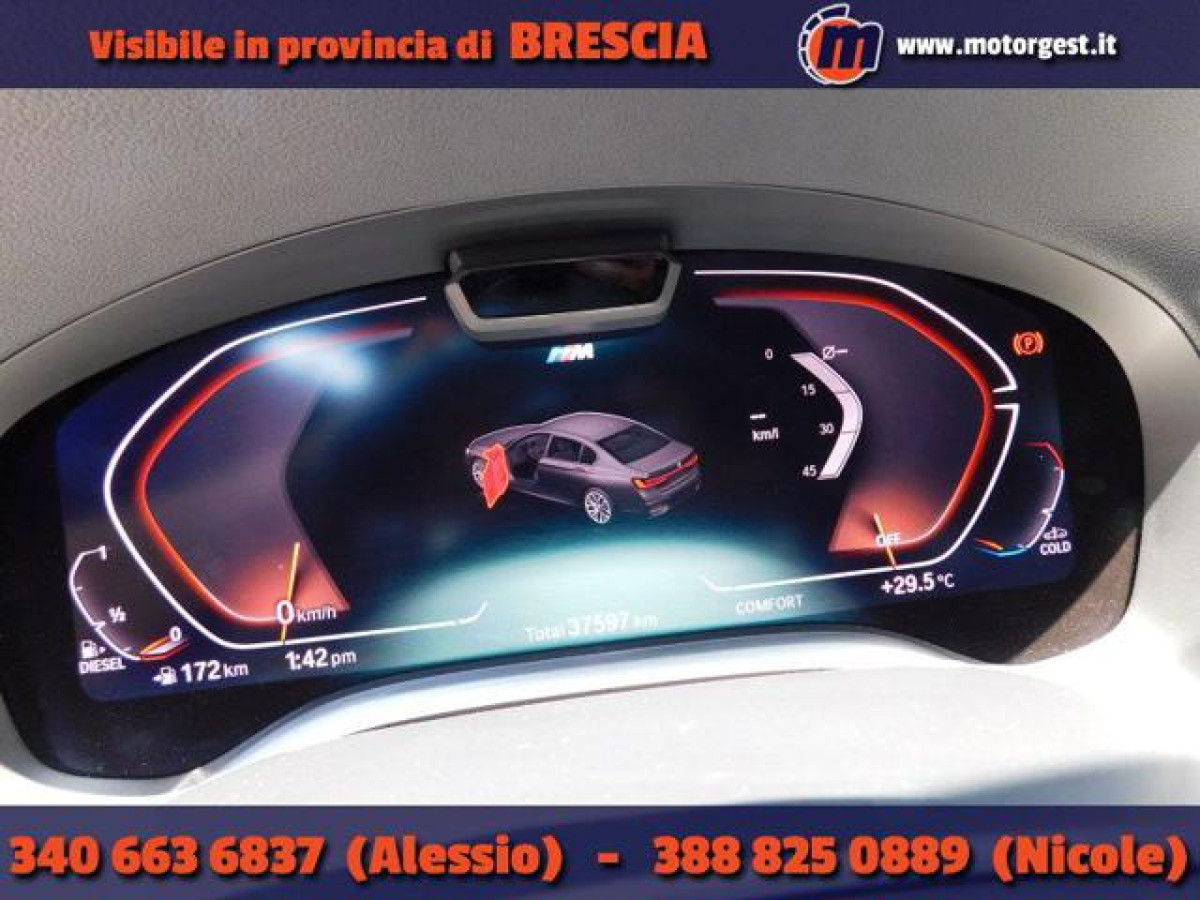 Fatturabile, Importo finanziabile. Trazione integrale, Cruise Control, Cronologia tagliandi, Filtro antiparticolato, Bluetooth, Tetto panorama, Luci diurne, Isofix, Head-up display, Start/Stop Automatico, Sensore di luce, Telecamera per parcheggio assistito, Vivavoce, Sensori di parcheggio anteriori, Sensori di parcheggio posteriori, Sensore di pioggia, Specchietti laterali elettrici, Pacchetto sportivo, Sospensioni pneumatiche, Supporto lombare, Sedili massaggianti, Sedili ventilati, Volante riscaldabile, Sound system, Touch screen, USB, Controllo vocale, Portellone posteriore elettrico, Parabrezza riscaldabile, Sistema di riconoscimento della stanchez, Chiusura centralizzata senza chiave, Bracciolo, Adaptive Cruise Control, Luci diurne LED, Airbag posteriore, Airbag testa, Riconoscimento dei segnali stradali, Vetri oscurati, Chiusura centralizzata telecomandata, Climatizzatore automatico, 4 zone, Freno di stazionamento elettrico, Fari full-LED, Regolazione elettrica del sedile posteri, Sistema di avviso di distanza, Streaming musicale integrato, Assistente abbaglianti, Sistema lavafari, Pneumatici estivi, Kit antipanne, Luce d\'ambiente, Hotspot Wi-Fi, Apple CarPlay, Android Auto, Schermo multifunzione interamente digita, Specchietto retrovisore con funzione ant, 360° camera. - VISIBILE SOLO SU APPUNTAMENTO - Chiama il [phoneNum:MzQwIDY2MyA2ODM3] o scrivi, anche su WhatsApp, per maggiori informazioni ed eventualmente fissare una videochiamata. Sono il Consulente di MotorGest Alessio Catarinolo e ho ispezionato personalmente questo veicolo, che ha superato i nostri numerosi test di qualità. La GARANZIA GUASTI e il SOCCORSO STRADALE in tutta Europa sono inclusi nel prezzo per 12 mesi. Se desideri tutele ancora superiori oppure vuoi estendere la garanzia a 24 mesi sarò lieto di aiutarti a trovare la soluzione più adatta alle tue esigenze. Oggi proponiamo stupenda BMW 740 LD Xdrive, in condizioni assolutamente pari al nuovo e con soli 37500 chilometri; l\'auto viene usata pochissimo e sempre tenuta in garage dal suo scrupoloso proprietario. Auto bellissima in questa tipica colorazione grigia, cerchio diamantato da 19 pollici, inserti M sport, tetto apribile, portellone posteriore elettrico, regolazione elettrica di tutti i sedili, sistema infotainment di ultimissima generazione e tutta una serie di infiniti optional da scoprire. Auto piacevolissima alla guida, molto comoda, potente, divertente, lussuosa e con consumi decisamente eccellenti. Vi aspettiamo per provarla! Se desideri una visione più approfondita e dettagliata del veicolo ti consiglio di cercare l’annuncio sul sito di MotorGest, dove troverai fino a 100 fotografie e contenuti video, potrai richiedere la valutazione del tuo usato da dare in permuta e ottenere una soluzione personalizzata per finanziare il tuo acquisto. Per una compravendita più serena puoi inoltre richiedere il servizio di Pagamento Sicuro MotorGest by Pleggit, un sistema che tutela al 100% sia l\'acquirente, sia il venditore..