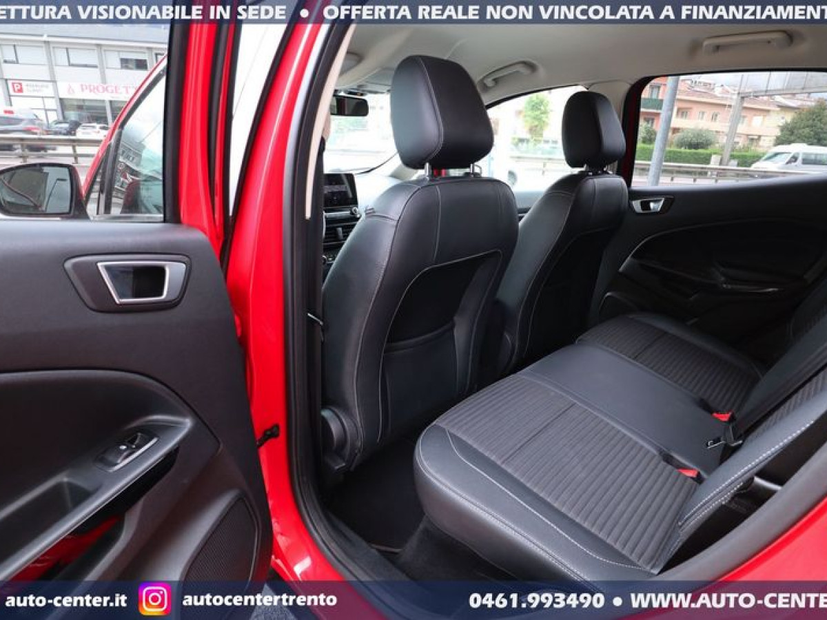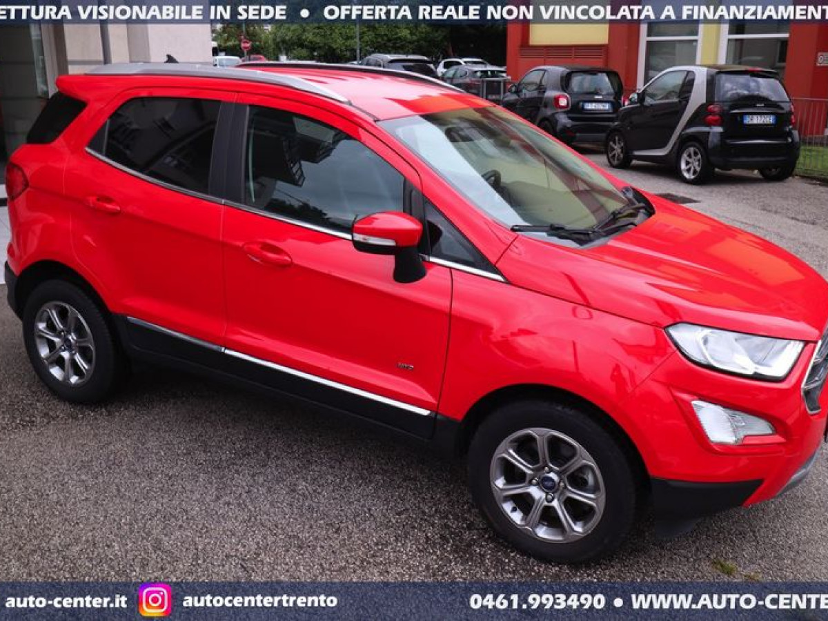 DEK:[[phoneNum:MTAxODU0MzE=]] DIAMO PRECEDENZA ALLE RICHIESTE COMPLETE DI RECAPITO TELEFONICO Siamo organizzati per trattativa ed acquisto A DISTANZA. Ci potete contattare compilando l\'apposito modulo, via mail, oppure telefonicamente: -- SALONE VENDITE 0461-993490 -- SIMONE [phoneNum:MzQwNjI5Mzc0MA==] -- LUCA [phoneNum:MzQ3NTQ5MDY3MA==] -- Usato di importazione europea in OTTIME condizioni con chilometraggio certificato. Cronologia Service FORD: 12/2020 con 21.702 km 10/2021 con 37.722 km 08/2022 con 54.392 km Nuovo tagliando compreso nel prezzo IVA DEDUCIBILE POSSIBILITA\' FINANZIAMENTO • Riferimento ECO-824 • Prima immatricolazione 08/2019 • Chilometraggio 70.888 KM CERTIFICATI • Garanzia 12 MESI • Passaggio / IPT non compreso nel prezzo • Valutiamo permute anche di valore superiore (se di nostro interesse) • NON ritiriamo Moto e Auto d’epoca; NON accettiamo offerte al ribasso • PRONTA CONSEGNA IN SEDE A TRENTO • Visionabile da Lunedì a Sabato (Sabato aperti dalle 9.00 alle 13.00) • È gradito l’APPUNTAMENTO FORD ECOSPORT 1.5 TDCI AWD 4X4 TITANIUM MANUALE 125CV EURO6 COLORE ESTERNO Rosso pastello INTERNI Pelle Tessuto Nero ALLESTIMENTO INCLUSO • 5 porte • 5 posti • Apple Carplay, AndroidAuto • Attacchi di sicurezza Isofix • Barre \"alluminium look\" longitudinali sul tetto • Bluetooth • Bracciolo guidatore • Cambio manuale a 6 marce • Cerchi in lega da 16\" • Climatizzatore a controllo automatico • Comandi vocali • Cruise control • Fari automatici on/off • Fari fendinebbia • Keyless Entry & Start • Interruttore PADI - disattivazione airbag passeggero anteriore • Luci diurne a LED • Pressure Monitoring System • Privacy glass • Retrovisori esterni ripiegabili eletricamente e riscaldati • Sensori parcheggio anteriori posteriori • SYNC navigation touchscreen • Telecamera posteriore • Tergicristalli con sensore pioggia Nelle richieste prego specificare PROVINCIA DI RESIDENZA e descrizione dell\'eventuale permuta Questa scheda è compilata con precisione e trasparenza ma non costituisce un impegno contrattuale. Ogni particolare viene verificato e concordato in fase di definizione del contratto. Gli equipaggiamenti di serie possono variare in base alla configurazione finale della vettura e secondo optional extra presenti. I prezzi esposti si intendono IVA inclusa, IPT ESCLUSA PERCHE\' SCEGLIERE UN\'OFFERTA ONLINE AUTO-CENTER • (1) Pubblichiamo solo le MIGLIORI AUTO che acquistiamo o ritiriamo • (2) Le auto sono tutte di NOSTRA PROPRIETA\' • (3) Possibilità di servizio CONSEGNA A DOMICILIO • (4) Ritiriamo usato in PERMUTA (anche di valore superiore) • (5) Assistenza per applicazione LEGGE 104 • (6) Puoi effettuare manutenzioni, tagliandi e interventi in GARANZIA nella tua zona di residenza. Grazie a questo vendiamo IN TUTTA ITALIA • (7) Offriamo FINANZIAMENTI (o LEASING) classici o con maxirata finale, anche con anticipo ridotto (su alcune vetture è possibile anche ZERO ANTICIPO e durata fino ad 84 mesi) •