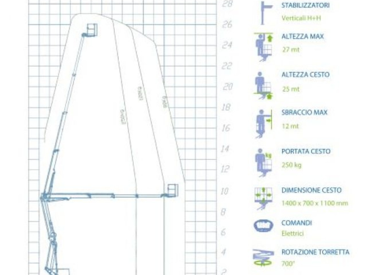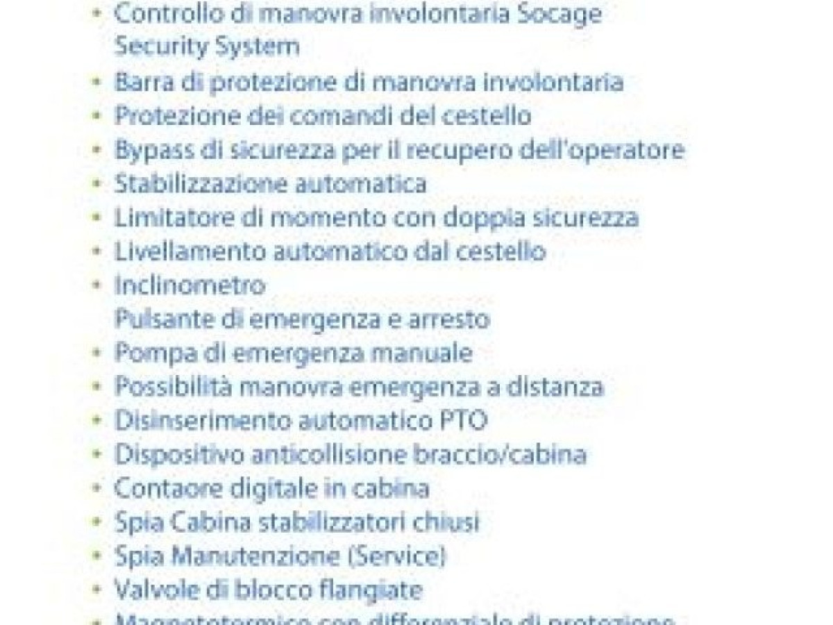 IVECO DAILY 35S14 2.3 136CV PASSO 3750 3 POSTI , CON SOSPENSIONI RINFORZATA BILAMA , PIATTAFORMA AEREA SOCAGE 27 METRI FORSTE 27D SPEED , LA MACCHINA VIENE FORNITA CON TUTTA LA DOCUMENTAZIONE PER INDUSTRIA 4.0 E SABATINI EURO 95000,00 IMPOSTE ESCLUSE PER INFO [phoneNum:MzQwIDg0MTA0NjE=] ALEX - [phoneNum:MzM1IDM5NTU3NA==] DAVIDE MASSIMA ALTEZZA DI LAVORO 27 METRI , CESTELLO IN ALLUMINIO , ALTEZZA PIANO CESTELLO 25 METRI , DIMENSIONE CESTELLO 1400X700X1100 , TIPO STABILIZZATORI H+H , MASSIMO SBRACCIO LATERALE 12 METRI , PORTATA MASSIMA NEL CESTELLO 250 KG , ROTAZIONE TORRETTA 700° , ROTAZIONE CESTELLO 90°+90° TARA 3.5 T. MANUTENZIONE E ESTENSIONE DI GARANZIA SUL BRACCIO PRESSO LA SEDE PIU\' VICINA DI RESIDENZA DEL CLIENTE CARATTERISTICHE TECNICHE Cestello in alluminio: 1400 x 700 x 1100 mm Rotazione idraulica del cestello 90º+90º Rotazione torretta 700º Tubi e cavi installati all’interno del braccio Chiusura automatica parte aerea Stabilizzazione automatica SPEED Stabilizzatori verticali H+H con extra-corsa Comandi stabilizzazione automatica dal cestello e da terra Comandi elettroidraulici proporzionale con regolazione della velocità di tutti i movimenti Sistema gestione elettronico CAN BUS 4 piastre di appoggio a terra Presa elettrica 230V e 12V sul cestello Possibilità di manovra simultanea Trattamento in cataforesi con verniciatura a polvere Spia di centraggio parte aerea sul cestello Regolazione automatica dei giri motore Ci riserviamo modifiche di prezzo ed errori di pubblicazione, le informazioni qui scritte non hanno validità contrattuale. Messaggio pubblicitario. Per ulteriori informazioni richiedere il “Modulo informazioni europee di Base sul credito ai consumatori” (SECCI) e copia del testo contrattuale. Salvo approvazione finanziaria. PAGAMENTO ANCHE PICCOLE RATE SENZA ANTICIPO, SALVO APPROVAZIONE FINANZIARIA. NON SEMPRE RIESCO A RISPONDERE VELOCEMENTE ALLE MAIL PER NON ASPETTARE TANTO TEMPO VI CONSIGLIO DI TELEFONARE. VISITA IL NOSTRO SITO www.marinelliauto.net UN SALUTO A TUTTI CI TROVIAMO IN VIA STRADA STATALE ROMEA 28/34 AL KM 40 A VACCOLINO DI COMACCHIO (FE) PER PUNTARE IL NAVIGATORE INSERITE VIA SAN LUCA VACCOLINO DI COMACCHIO A 40 KM DA RAVENNA.