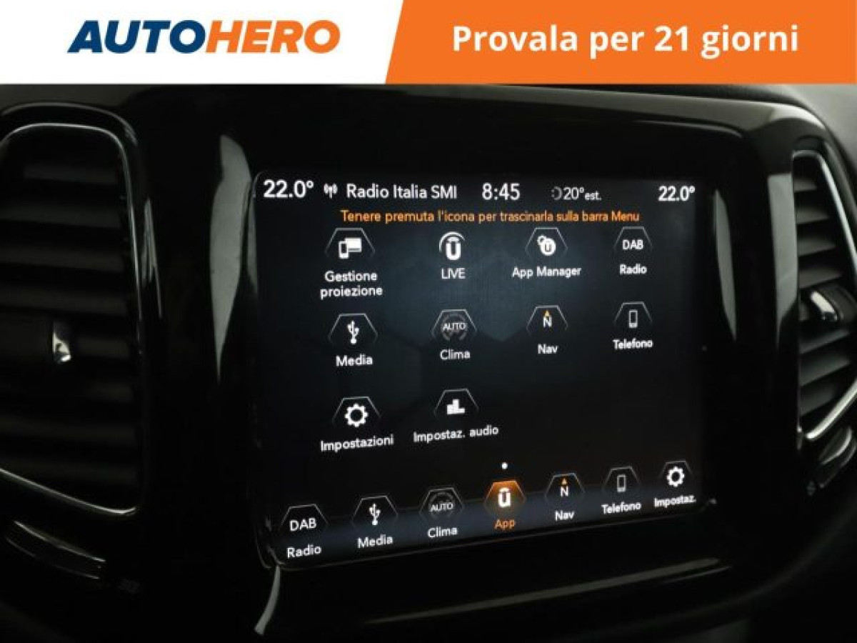 Bluetooth, Isofix, Sensori di parcheggio anteriori, Telecamera per parcheggio assistito, Adaptive Cruise Control, Airbag testa, Riconoscimento dei segnali stradali, Sedile posteriore sdoppiato, Start/Stop Automatico, Sensore di luce, Sensori di parcheggio posteriori, Specchietti laterali elettrici, Chiusura centralizzata senza chiave, Frenata d\'emergenza assistita, Climatizzatore automatico, 2 zone, Freno di stazionamento elettrico, Sistema di parcheggio automatico, Apple CarPlay, Bracciolo, Vetri oscurati, Controllo elettronico della corsia, Android Auto. PAGAMENTO ALLA CONSEGNA, RESO GRATUITO E 1 ANNO DI GARANZIA: SOLO SU AUTOHERO! _________________________________________ SEMPRE INCLUSO: - Pagamento alla consegna, prima vedi poi paghi - Reso gratuito, avrai 21 giorni e 500 km per cambiare idea - Finanziamento flessibile**, personalizzabile senza vincoli - Standard di qualità, veicoli ricondizionati e sanificati - Semplicità nell\'acquisto, gestiamo noi tutte le pratiche - Acquisto sicuro, più di 1000 feedback positivi su Trustpilot - Garanzia 12 mesi inclusa, estendibile fino a 36 mesi _________________________________________ SALIAMO A BORDO! Tra le nostre Jeep Compass, questa si presenta nell allestimento Limited che coi suoi numerosi optional migliorerà la tua esperienza di guida, accompagnandoti a destinazione in tutta serenità. Immatricolata a giugno 2019, si presenta in perfette condizioni. L alimentazione Diesel è ancora la soluzione migliore per gli spostamenti più lunghi e per garantire maggiore vita al tuo motore. Infine, la vita a bordo sarà più facile grazie a Chiusura centralizzata, e . Che aspetti? Visita il nostro sito per scoprire tutti i dettagli e la sua storia! _________________________________________ CONTATTACI SUBITO: - Telefonicamente al numero indicato nell\'annuncio - Tramite mail a clienti@autohero.com - Sul nostro sito www.autohero.com - Offerta N.FU35668 Annuncio completo: https://www.autohero.com/it/Link/id/b310d599-69ad-4d37-adce-21553a59008f/?utm_source=CLA&utm_medium=classifieds&utm_campaign=classifieds_IT.
