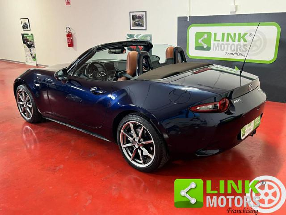 Vettura aziendale, Fatturabile, Pronta consegna, Importo finanziabile, Occasione, Unico proprietario. Cruise Control, Cronologia tagliandi, MP3, Bluetooth, Fari direzionali, Luci diurne, Isofix, Start/Stop Automatico, Sensore di luce, Telecamera per parcheggio assistito, Vivavoce, Sensori di parcheggio posteriori, Sensore di pioggia, Specchietti laterali elettrici, Pacchetto sportivo, Sospensioni sportive, Supporto lombare, Sound system, Touch screen, USB, Autoradio digitale, Controllo vocale, Sistema di riconoscimento della stanchez, Fari LED, Chiusura centralizzata senza chiave, Bracciolo, Monitoraggio pressione pneumatici, Hill holder, Luci diurne LED, Airbag testa, Riconoscimento dei segnali stradali, Controllo elettronico della corsia, Chiusura centralizzata telecomandata, Fari full-LED, Sistema di avviso di distanza, Sedile passeggero ribaltabile, Streaming musicale integrato, Assistente abbaglianti, Pneumatici estivi, Kit antipanne, Apple CarPlay, Android Auto, Schermo multifunzione interamente digita, Specchietto retrovisore con funzione ant. Mazda MX-5 2.0L Skyactiv-G KAZARI – Maggio 2023 4000 km | Garanzia ufficiale Mazda fino a Maggio 2029 Questa spettacolare Mazda MX-5 nella versione KAZARI è una vera bomba su strada! Equipaggiata con il potente motore 2.0 Skyactiv-G da 184 CV, cambio manuale e sistema i-eloop per il recupero di energia in frenata, offre prestazioni emozionanti e un\'ottima efficienza con 14,6 km/l. Il colore Crystal Deep Blue con la capote brown e gli interni in pelle cuoio traforata color biscotto la rendono un\'auto elegante e sportiva allo stesso tempo. I cerchi bruniti da 17 e la carrozzeria impeccabile completano il look di questa spider che ha solo 3700 km, ed è in condizioni pari al nuovo. Dotazione di serie e optional: Sedili riscaldabili, navigatore, telecamera di parcheggio, BLIS, e molto altro per un comfort senza compromessi. Sistema di sicurezza avanzato con ABS, airbag, assistente abbaglianti, monitoraggio angolo cieco, e controllo corsia. Fari full-LED, sospensioni sportive, e volante multifunzione per un’esperienza di guida dinamica e sicura. La manutenzione è stata effettuata esclusivamente presso Mazda ufficiale, l\'ultima volta a 3200 km (maggio 2024), ed è pronta per affrontare nuove emozionanti avventure. Mazda MX-5 è il mito per chi ama la guida pura, regalando emozioni forti sui percorsi tortuosi e in pista grazie al suo motore che spinge fin dai bassi giri, senza mai essere assetato di carburante. Vero “mito” per gli amanti della bella guida, la Mazda MX-5 è una spiderina a due posti con tetto in tela che regala forti emozioni a chi la porta sui percorsi tortuosi o in pista. Il nuovo motore 2.0, da 184 CV, allunga fino a 7500 giri e spinge forte fin dai bassi giri, senza essere assetato di benzina; sempre molto valido il cambio, per precisione degli innesti e brevità dell’escursione della leva. Optionals e Accessori: ABS, Airbag, Airbag Passeggero, Assistente abbaglianti, Blind spot monitor, Chiusura centralizzata senza chiave, Chiusura centralizzata telecomandata, Controllo elettronico della corsia, Controllo trazione, ESP, Fari Xenon, Fendinebbia, Kit antipanne, Luci diurne, Riconoscimento dei segnali stradali, Sensore di luce, Sistema di avviso di distanza, Specchietto retrovisore con funzione antiabbagliamento, Alzacristalli elettrici, Boardcomputer, Bracciolo, Chiusura centralizzata, Climatizzatore, Controllo automatico clima, Volante in pelle, Hill holder, Interni in pelle, Isofix, Pacchetto sportivo, Park Distance Control, Telecamera per parcheggio assistito, Tettuccio apribile, Sedili riscaldati, Sensore di pioggia, Sensori di parcheggio posteriori, Servosterzo, Specchietti laterali elettrici, Supporto lombare, Autoradio, Bluetooth, Controllo vocale, USB, Vivavoce, Volante multifunzione, MP3, Schermo multifunzione interamente digitale, Sistema di navigazione, Sound system, Cerchi in lega, Cronologia tagliandi, Seconda chiave presente,.