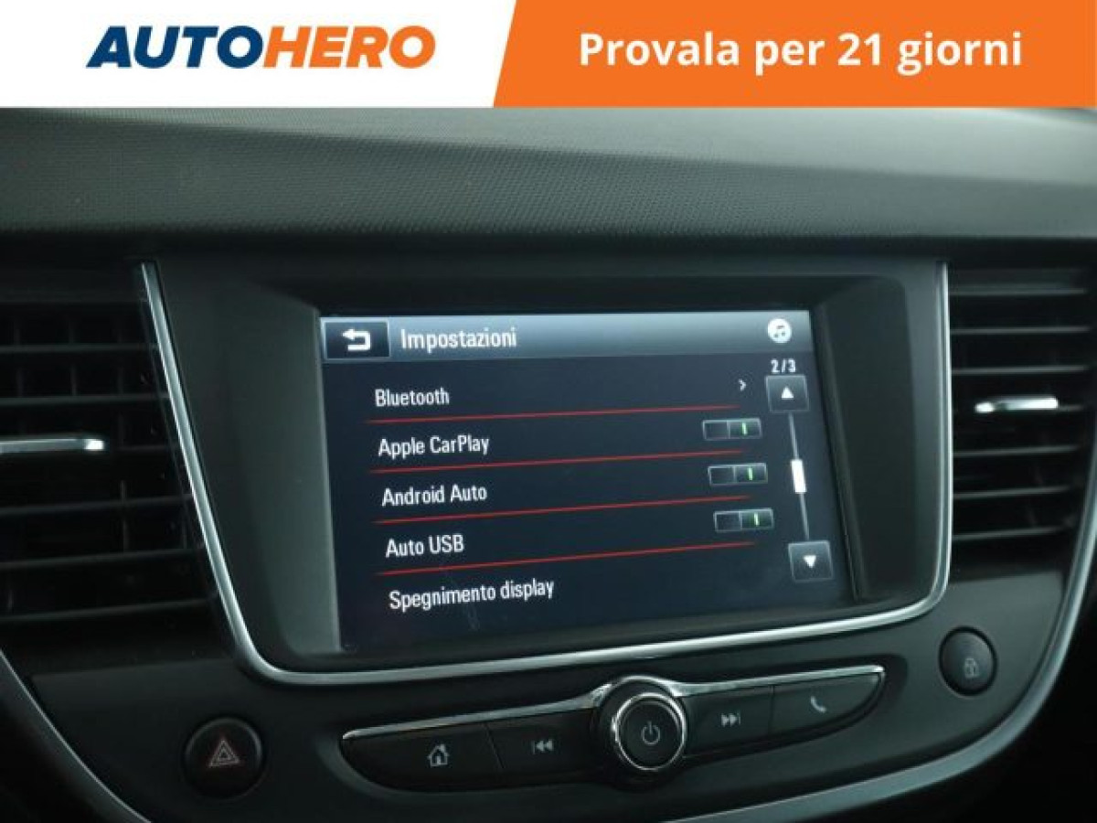 Cruise Control, Airbag testa, Riconoscimento dei segnali stradali, Sedile posteriore sdoppiato, Vetri oscurati, Controllo elettronico della corsia, Climatizzatore automatico, 2 zone, Apple CarPlay, Android Auto, Bluetooth, Isofix, Start/Stop Automatico, Sensori di parcheggio anteriori, Telecamera per parcheggio assistito, Sensore di pioggia, Sensore di luce, Sensori di parcheggio posteriori, Specchietti laterali elettrici, Bracciolo. PAGAMENTO ALLA CONSEGNA, RESO GRATUITO E 1 ANNO DI GARANZIA: SOLO SU AUTOHERO! _________________________________________ SEMPRE INCLUSO: - Pagamento alla consegna, prima vedi poi paghi - Reso gratuito, avrai 21 giorni e 500 km per cambiare idea - Finanziamento flessibile**, personalizzabile senza vincoli - Standard di qualità, veicoli ricondizionati e sanificati - Semplicità nell\'acquisto, gestiamo noi tutte le pratiche - Acquisto sicuro, più di 1000 feedback positivi su Trustpilot - Garanzia 12 mesi inclusa, estendibile fino a 36 mesi _________________________________________ SALIAMO A BORDO! Tra le nostre Opel Crossland X, questa si presenta nell allestimento Innovation che coi suoi numerosi optional migliorerà la tua esperienza di guida, accompagnandoti a destinazione in tutta serenità. Immatricolata a novembre 2019, si presenta in buone condizioni. L alimentazione Benzina sarà l ideale per muoversi sia in città che su percorsi più lunghi, senza limitazioni alla circolazione. Infine, la vita a bordo sarà più facile grazie a Chiusura centralizzata, e . Che aspetti? Visita il nostro sito per scoprire tutti i dettagli e la sua storia! _________________________________________ CONTATTACI SUBITO: - Telefonicamente al numero indicato nell\'annuncio - Tramite mail a clienti@autohero.com - Sul nostro sito www.autohero.com - Offerta N.DG93204 Annuncio completo: https://www.autohero.com/it/Link/id/c03d41db-7520-42e9-bae3-ca64739d345e/?utm_source=CLA&utm_medium=classifieds&utm_campaign=classifieds_IT.