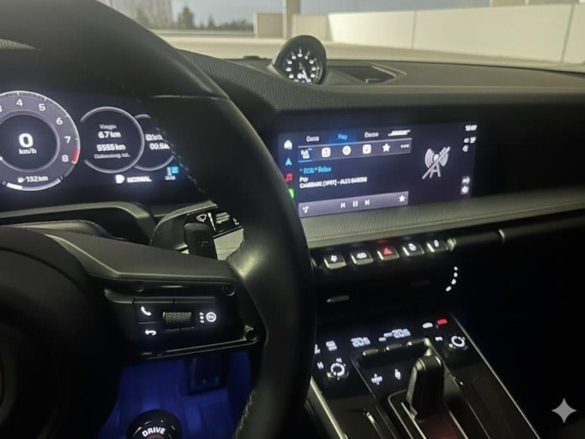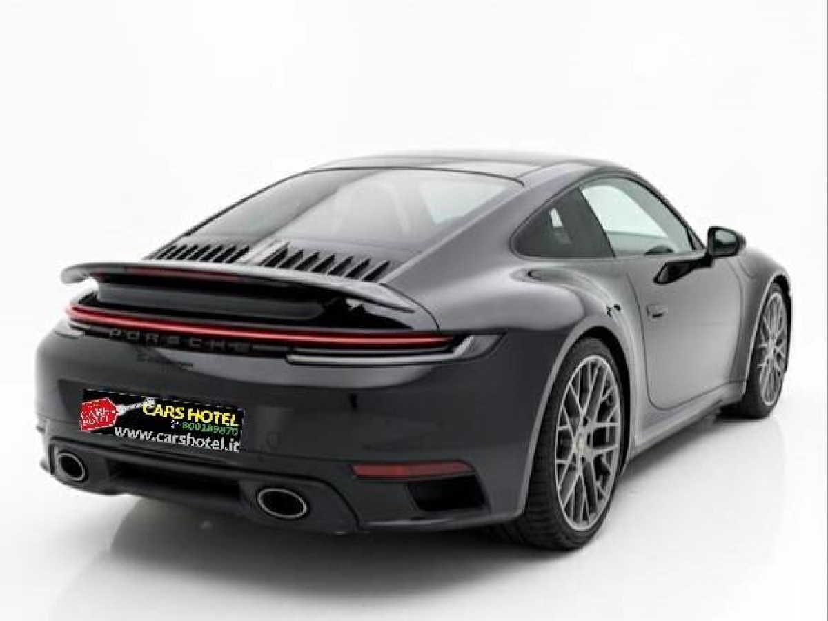 Porsche 911 Carrera coupé modello 992.2 Vettura in condizioni perfette. Unico proprietario. Garanzia ufficiale Porsche. Caratteristiche Motore boxer a 6 cilindri biturbo da 3,0 litri Trazione posteriore. Potenza massima: 290 kW (394 CV) Coppia massima: 450 Nm Principali Dotazioni di serie Cambio automatico \"Porsche Doppelkupplung a 8 marce (PDK)\". Cambio doppia frizione a 8 rapporti con comando manuale tramite paddle al volante. Include una modalità automatica Servosterzo elettromeccanico con rapporto di sterzo variabile e generatore di impulsi Porsche Active Suspension Management (PASM) Sistema di smorzamento attivo variabile elettronicamente con due modalità selezionabili manualmente (\"Normal\" e \"Sport\"). Impianto frenante con pinze freno nere. Pinze freno fisse monoblocco in alluminio a 6 pistoncini anteriori e pinze freno fisse monoblocco in alluminio a 4 pistoncini posteriori, dischi freno con diametro di 350 mm anteriori e posteriori, autoventilanti e forati Asse anteriore McPherson con barra antirollio. Asse posteriore multilink con barra antirollio. Freno di stazionamento elettrico. Funzione di avvio/arresto automatico. Servofreno elettromeccanico. Gestione dello stazionamento con funzione HOLD. Porsche Stability Management (PSM) incluso ABS con funzioni di frenata estese. Minigonne laterali con finiture nere. Parte inferiore degli specchietti e base in nero. Profili finestrini laterali in nero. Leve apriporta verniciate nel colore dell\'esterno. Griglia del cofano posteriore a lamelle verticali. Sicurezza pedoni. Attivazione automatica dei fari, inclusa illuminazione \"Welcome Home\". Maniglie apriporta a scomparsa. Impianto lavavetri con spazzole aerodinamiche e getti lavavetri. Fari principali a LED Matrix I fari a LED Matrix intelligenti, basati su telecamera e con la tipica firma luminosa Porsche a 4 punti. Fascia luminosa con logo \"PORSCHE\". - Luci posteriori a LED tridimensionali inclusa illuminazione per la retromarcia e indicatori di direzione, nonché terza luce stop integrata. Luci di posizione e retronebbia integrate. Fascia luminosa continua con logo «PORSCHE» integrato in argento chiaro lucido. Specchietti esterni ripiegabili elettricamente con illuminazione di cortesia. Specchietti retrovisori interni ed esterni ad oscuramento automatico con sensore pioggia integrato. Parabrezza con vetro termoisolante. Volante multifunzione riscaldabile e selettore modalità di guida Normal, Sport, Sport plus e Wet. Volante a regolazione manuale di profondità e altezza. Telecamera posteriore. Park Assist anteriore e posteriore con avviso visivo e acustico. Assistenza al parcheggio tramite sensori anteriori e posteriori a ultrasuoni integrati. Riconoscimento dei segnali stradali. Assistente al mantenimento di corsia. Cruise Control. Avvertimento collisione e assistenza alla frenata inclusa protezione pedoni. Rilevamento attenzione conducente. Chiamata d\'emergenza eCall e bCall. Climatizzatore automatico a 2 zone con impostazioni di temperatura separate per conducente e passeggero anteriore, modalità di ricircolo automatico con sensore di qualità dell\'aria Filtro antiparticolato/polline a carboni attivi Light Design Package. Illuminazione ambientale aggiuntiva attorno ai vani portaoggetti delle porte, alla consolle centrale e alla zona posteriore. Colore dimmerabile e selezionabile, inclusa l\'illuminazione del vano piedi anteriore. Sistema di allarme con sorveglianza interna. Pacchetto non fumatori. Predisposizione Alcol Interlock. Airbag - Airbag full size a due stadi per conducente e passeggero anteriore - Porsche Side Impact Protection System (POSIP), composto da elementi di protezione dagli urti laterali nelle porte ed airbag laterali airbag per il torace integrati nei supporti dei sedili anteriori e airbag a tendina per conducente e passeggero integrati nel tetto Keyless Drive. Chiusura centralizzata. Avviamento senza chiave. Consolle centrale ascendente con vano portaoggetti. Vano portaoggetti in ogni porta. Vano portaoggetti con serratura. Accessori extra serie vernice Nero Jet metallizzato. Denominazione del modello verniciata nel colore dell\'esterno. Logo \'PORSCHE\' verniciato in nero lucido. Cerchi RS Spyder in grigio vanadio metallizzato lucido da 20/21 pollici. Coprimozzi con scudo Porsche a colori. Profili finestrini laterali in nero lucido. Luci di cortesia a LED sulle porte con logo «PORSCHE». Tetto apribile in vetro scorrevole e inclinabile. Sistema di sollevamento asse anteriore. Servosterzo Plus. Serbatoio carburante da 84 litri. Luci posteriori Exclusive Design. Vetratura posteriore privacy. Scudo Porsche sui poggiatesta Pacchetto Sport Chrono con App Porsche Track Precision e visualizzazione temperatura pneumatici. Impianto di scarico sportivo con terminali neri. Volante sportivo GT riscaldabile in pelle. Selettore marce PDK in alluminio. Pedali e poggiapiedi in alluminio. Listelli sottoporta illuminati in alluminio spazzolato argento scuro. Scudo Porsche sul coperchio del vano portaoggetti. Surround View con supporto attivo al parcheggio. Assistente al cambio di corsia. BOSE® Surround Sound System. Set di valvole con copri valvola decorativo (in colore nero con fregio Porsche a colori. Vasca per vano bagagli.