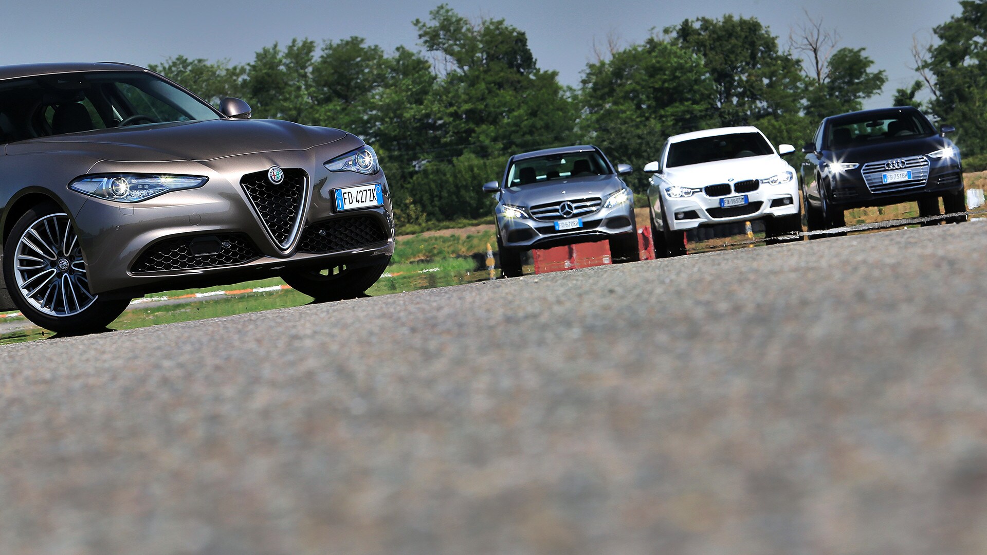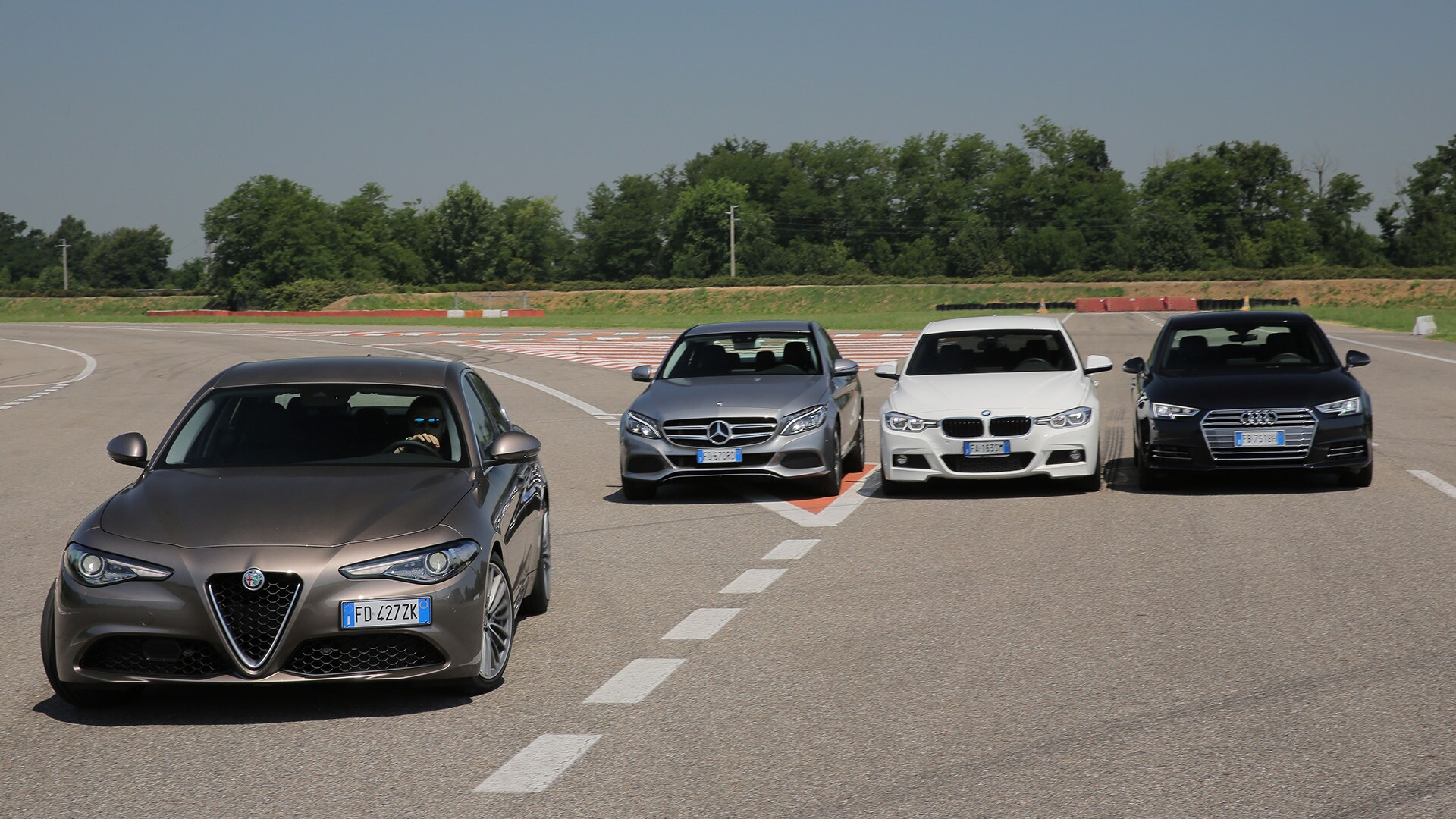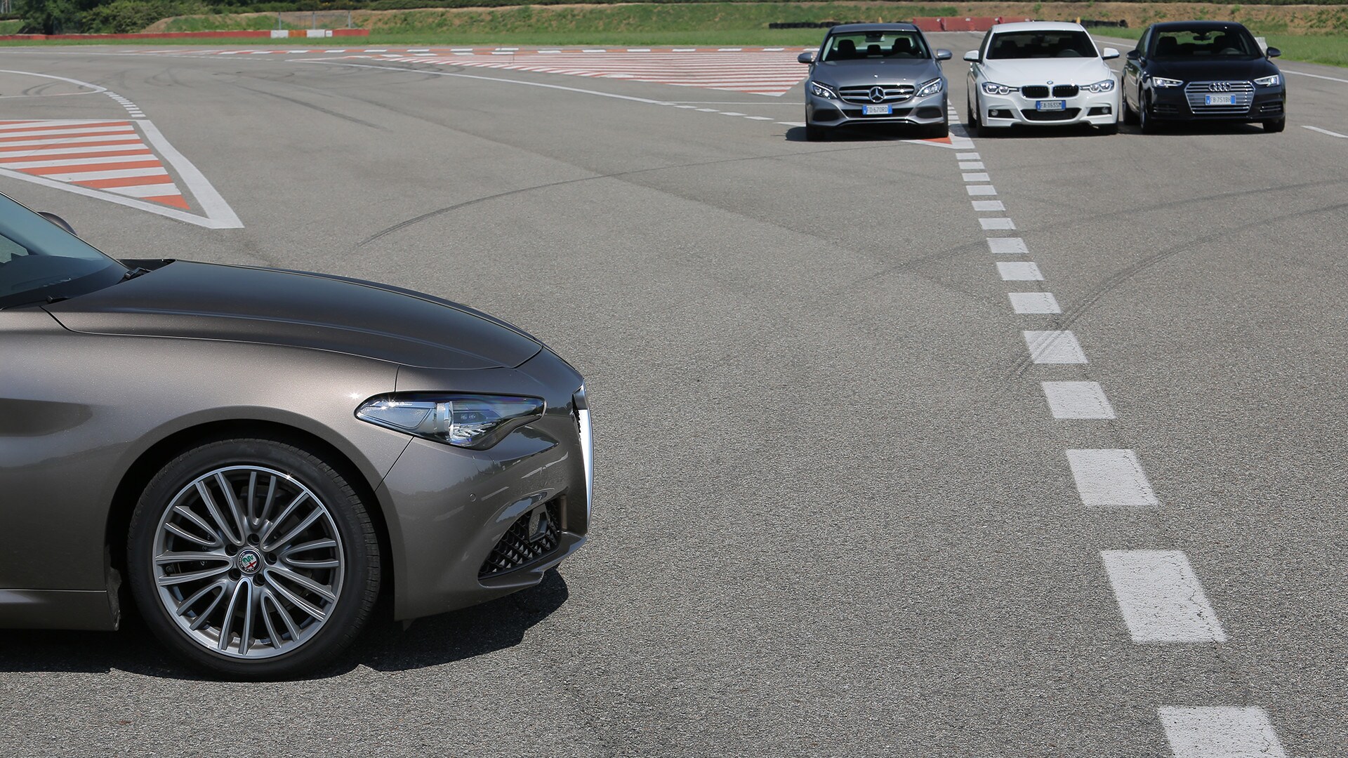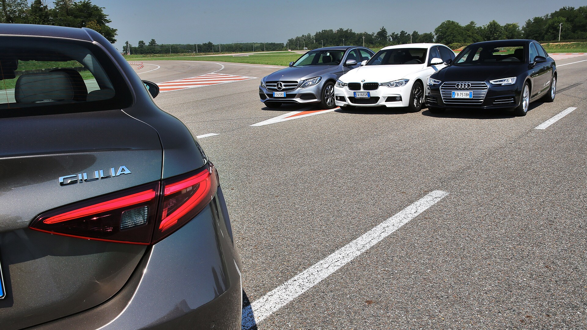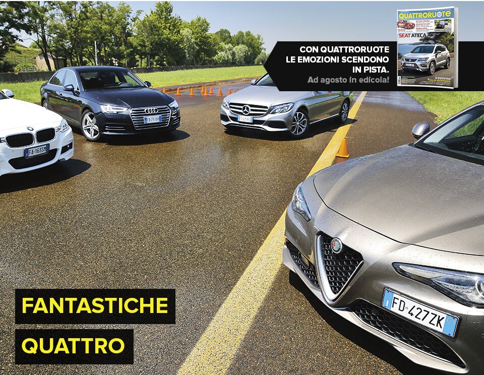 «La soluzione più semplice sarebbe scegliere la solita berlina tedesca»: così recita un passo della pubblicità televisiva della Giulia. In questa frase sono raccolti il senso e il significato della nuova berlina dell'Alfa Romeo: una Casa che per tanto tempo ha lasciato spazio alle concorrenti made in Germany e che oggi, verrebbe da dire finalmente, torna in campo con un modello progettato ex novo proprio per incrinare la leadership renana. La Giulia l'abbiamo provata due mesi fa e il risultato è stato più che lusinghiero. Ma era inevitabile arrivare al test definitivo: il confronto con Audi A4, BMW Serie 3 e Mercedes-Benz Classe C, che del segmento sono regine da anni e che, ognuna per un campo specifico, rappresentano il benchmark a cui riferirsi. Del resto, all'Alfa non negano come i progettisti si siano mossi avendo bene a mente le tre teutoniche di riferimento. Il primo indizio, in questo senso, arriva quando ti siedi: all'Alfa hanno ricalcato le misure tipiche delle rivali, con seduta bassa sul pavimento e un'impostazione che porta naturalmente a guidare con gambe e braccia distese. Insomma, un posto di guida comme il faut, senza dubbio. E la sfida si chiude in sostanziale parità pure quando si passa a considerare l'abitabilità: per tutte il quinto posto è una realtà che va cercata più che altro sulla carta di circolazione. Anche per la Audi, che in questo senso dovrebbe essere favorita dall'impostazione con motore trasversale e trazione anteriore. Dove invece non teme confronti, la A4, è nella finitura. Ciò per cui a Ingolstadt sono famosi da molti decenni è più vero che mai: la scelta dei materiali, la cura nella realizzazione, la predisposizione ad applicarsi con ostinata capacità anche a minuzie che pochi vedono e pochissimi soppesano la pongono un gradino sopra le altre. E, per quanto sia l'Alfa meglio rifinita di sempre, alla fine la Giulia riesce a tenere testa al massimo alla BMW. Un risultato peraltro più che onorevole, innanzitutto perché anche la Serie 3 è ben fatta e poi perché bisogna tenere conto di un aspetto non trascurabile: gli italiani si sono infilati in un comparto dal quale erano assenti da molto tempo, mentre i tedeschi lavorano da decenni (e senza soluzione di continuità) intorno al tema della berlina premium…
