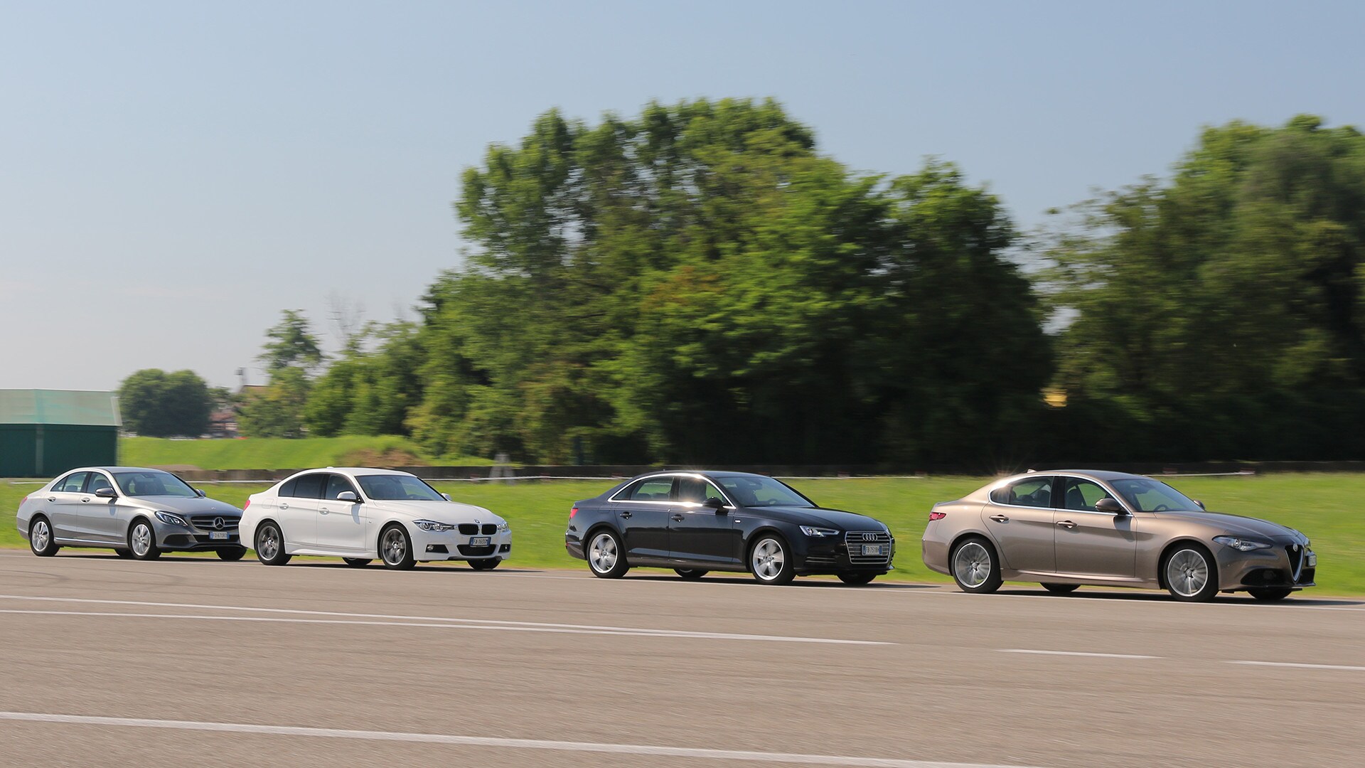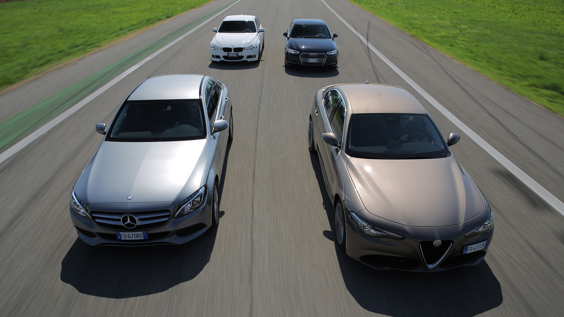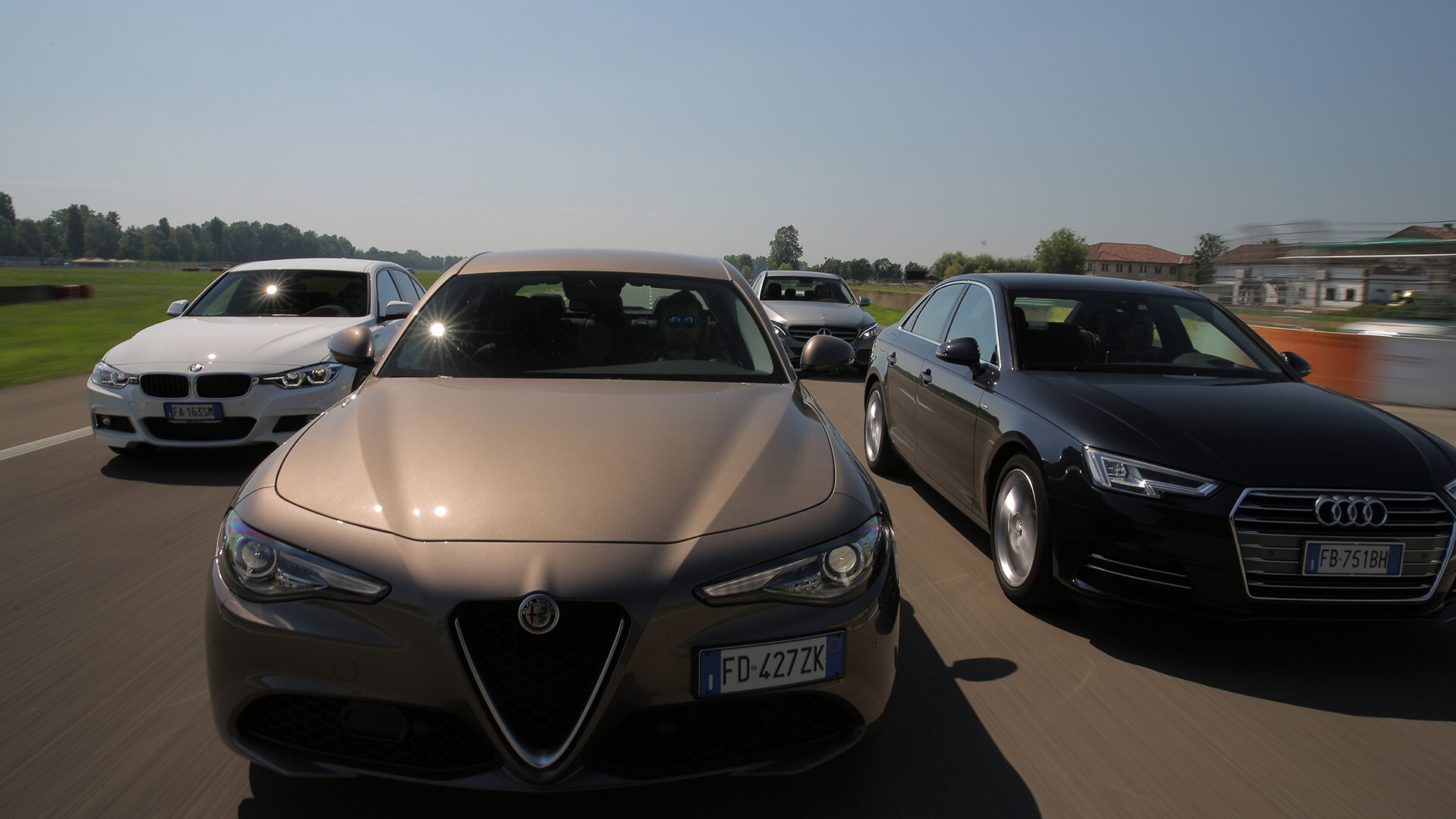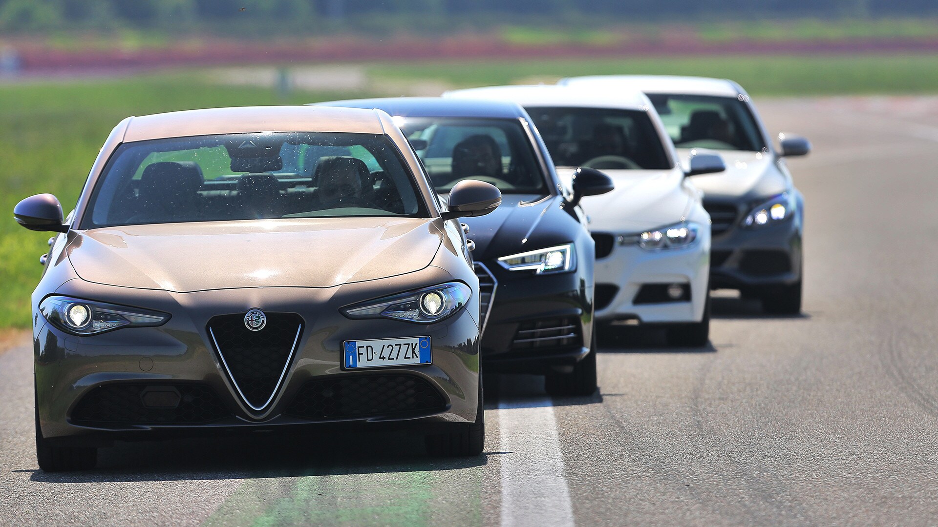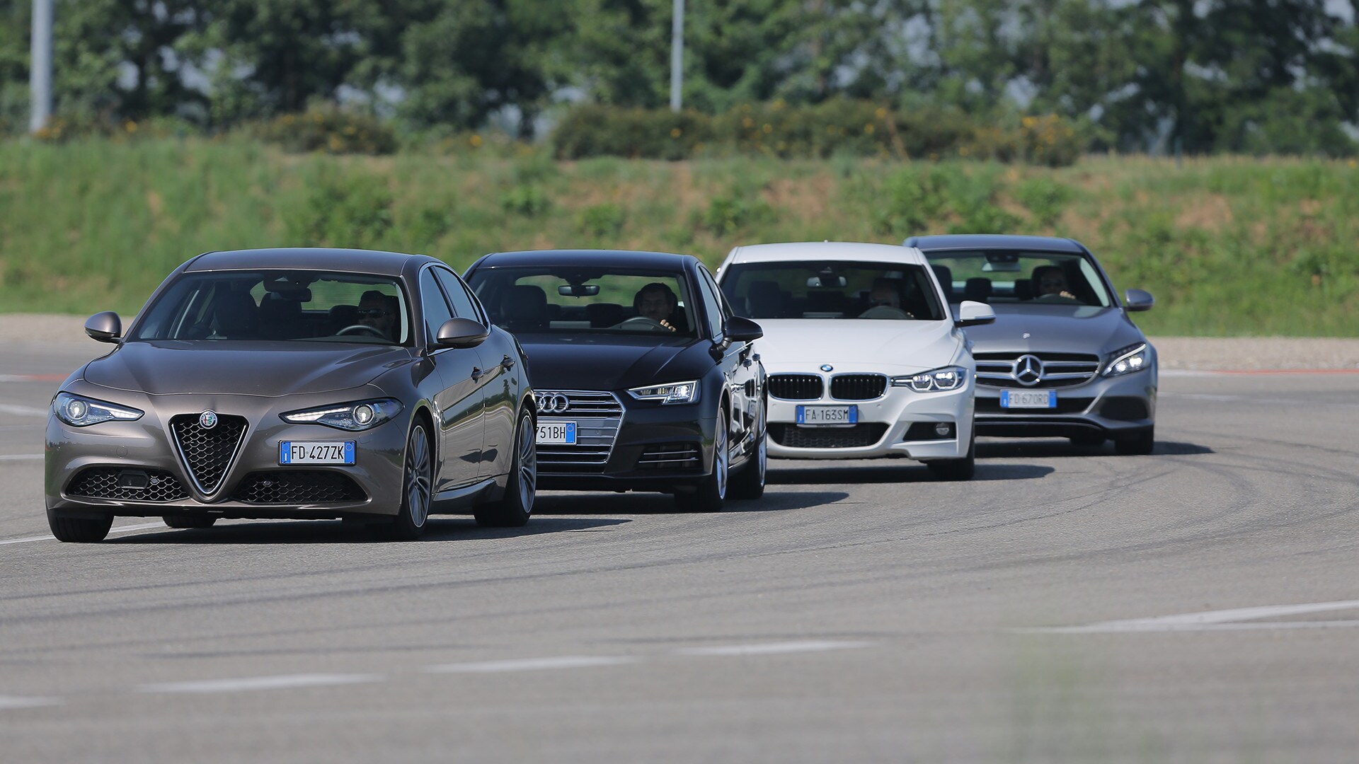 «La soluzione più semplice sarebbe scegliere la solita berlina tedesca»: così recita un passo della pubblicità televisiva della Giulia. In questa frase sono raccolti il senso e il significato della nuova berlina dell'Alfa Romeo: una Casa che per tanto tempo ha lasciato spazio alle concorrenti made in Germany e che oggi, verrebbe da dire finalmente, torna in campo con un modello progettato ex novo proprio per incrinare la leadership renana. La Giulia l'abbiamo provata due mesi fa e il risultato è stato più che lusinghiero. Ma era inevitabile arrivare al test definitivo: il confronto con Audi A4, BMW Serie 3 e Mercedes-Benz Classe C, che del segmento sono regine da anni e che, ognuna per un campo specifico, rappresentano il benchmark a cui riferirsi. Del resto, all'Alfa non negano come i progettisti si siano mossi avendo bene a mente le tre teutoniche di riferimento. Il primo indizio, in questo senso, arriva quando ti siedi: all'Alfa hanno ricalcato le misure tipiche delle rivali, con seduta bassa sul pavimento e un'impostazione che porta naturalmente a guidare con gambe e braccia distese. Insomma, un posto di guida comme il faut, senza dubbio. E la sfida si chiude in sostanziale parità pure quando si passa a considerare l'abitabilità: per tutte il quinto posto è una realtà che va cercata più che altro sulla carta di circolazione. Anche per la Audi, che in questo senso dovrebbe essere favorita dall'impostazione con motore trasversale e trazione anteriore. Dove invece non teme confronti, la A4, è nella finitura. Ciò per cui a Ingolstadt sono famosi da molti decenni è più vero che mai: la scelta dei materiali, la cura nella realizzazione, la predisposizione ad applicarsi con ostinata capacità anche a minuzie che pochi vedono e pochissimi soppesano la pongono un gradino sopra le altre. E, per quanto sia l'Alfa meglio rifinita di sempre, alla fine la Giulia riesce a tenere testa al massimo alla BMW. Un risultato peraltro più che onorevole, innanzitutto perché anche la Serie 3 è ben fatta e poi perché bisogna tenere conto di un aspetto non trascurabile: gli italiani si sono infilati in un comparto dal quale erano assenti da molto tempo, mentre i tedeschi lavorano da decenni (e senza soluzione di continuità) intorno al tema della berlina premium…