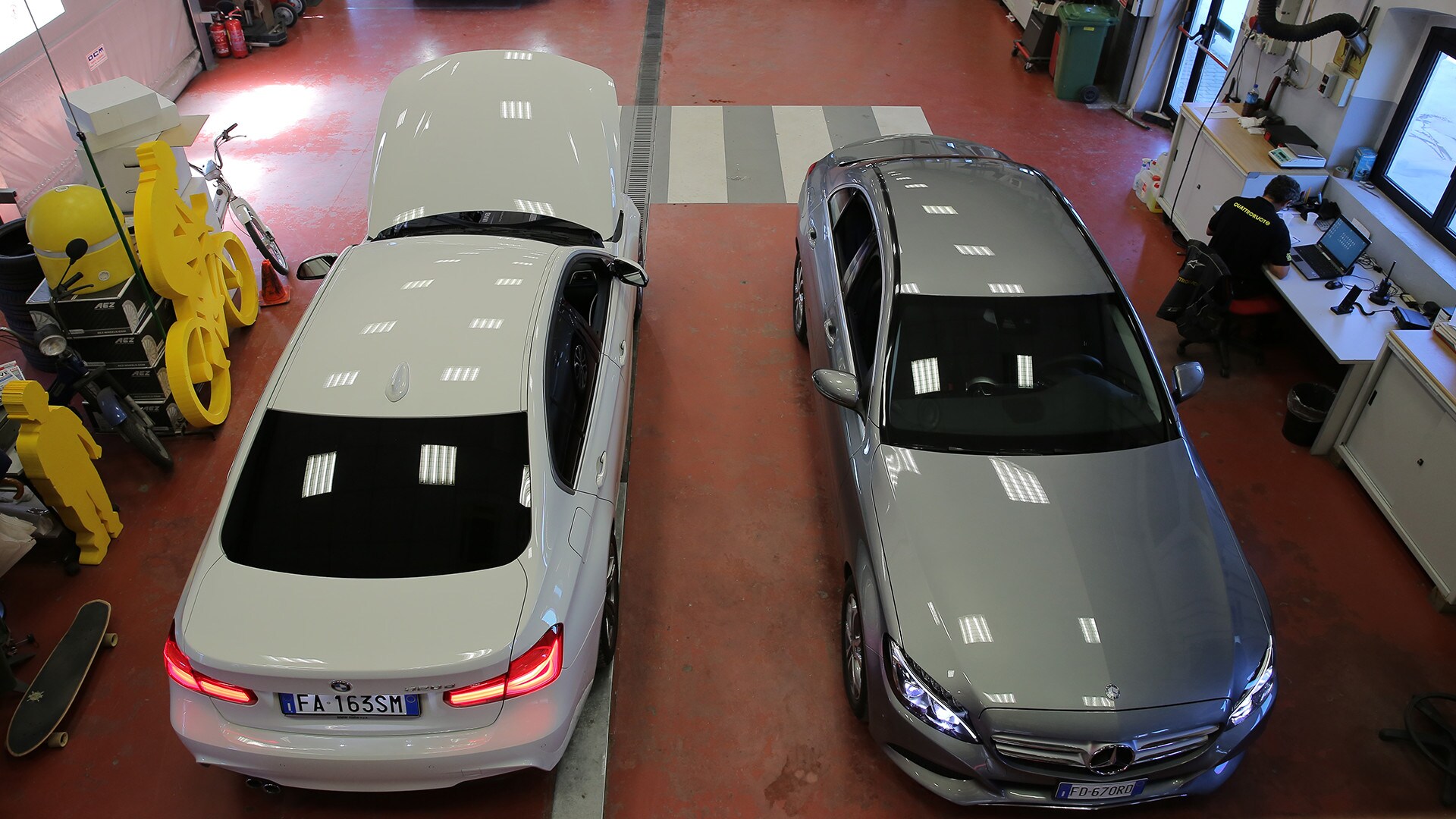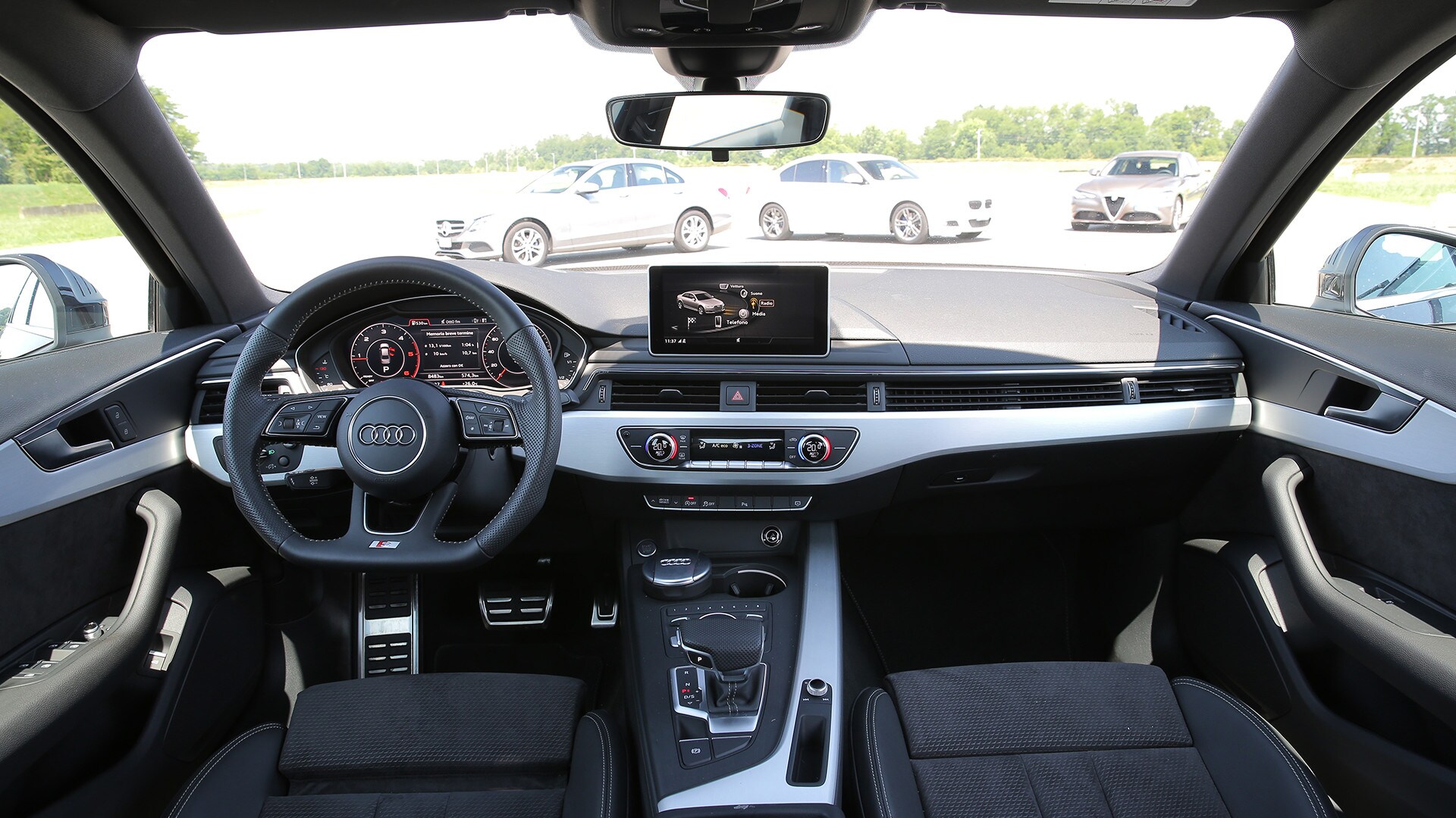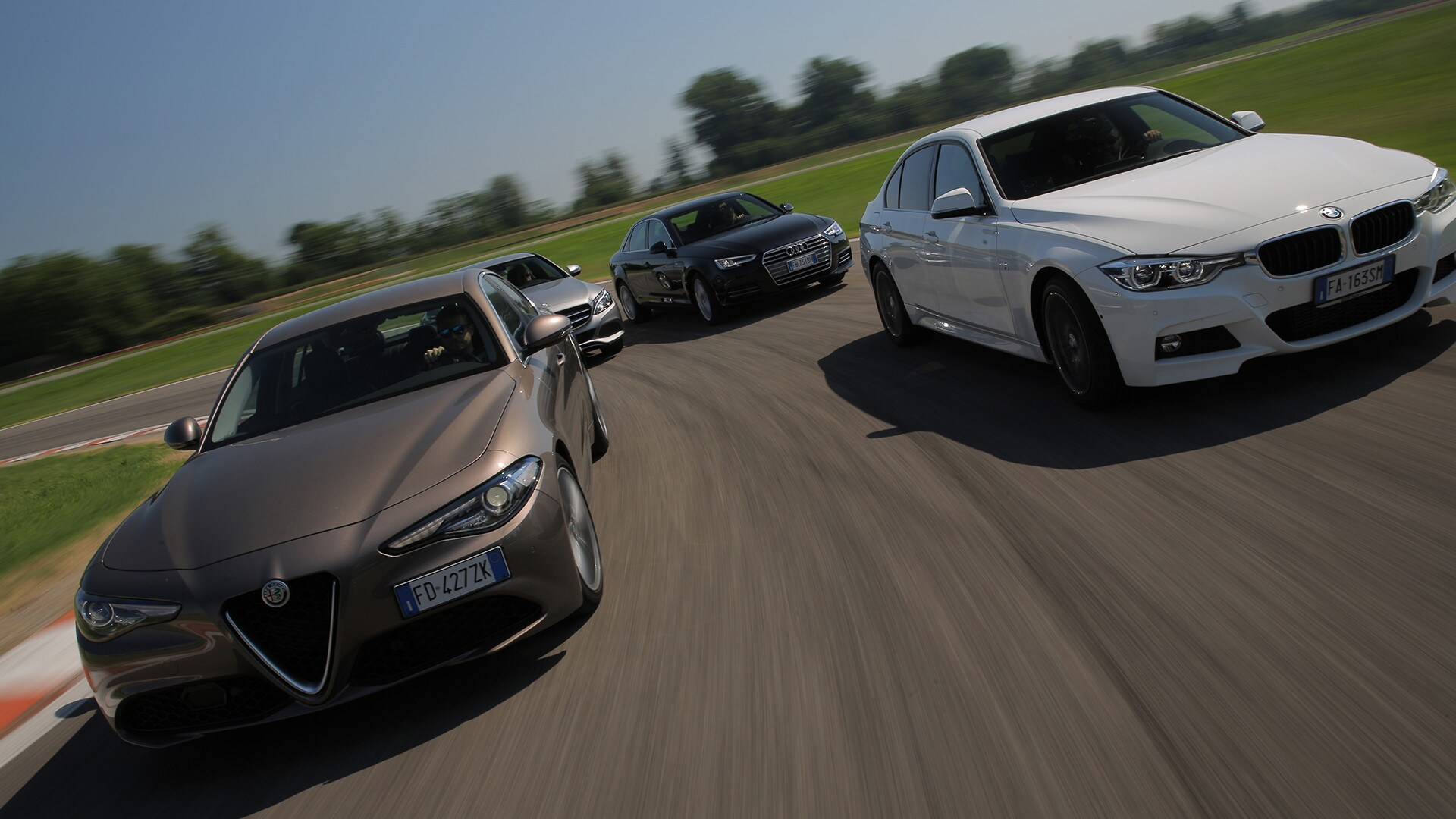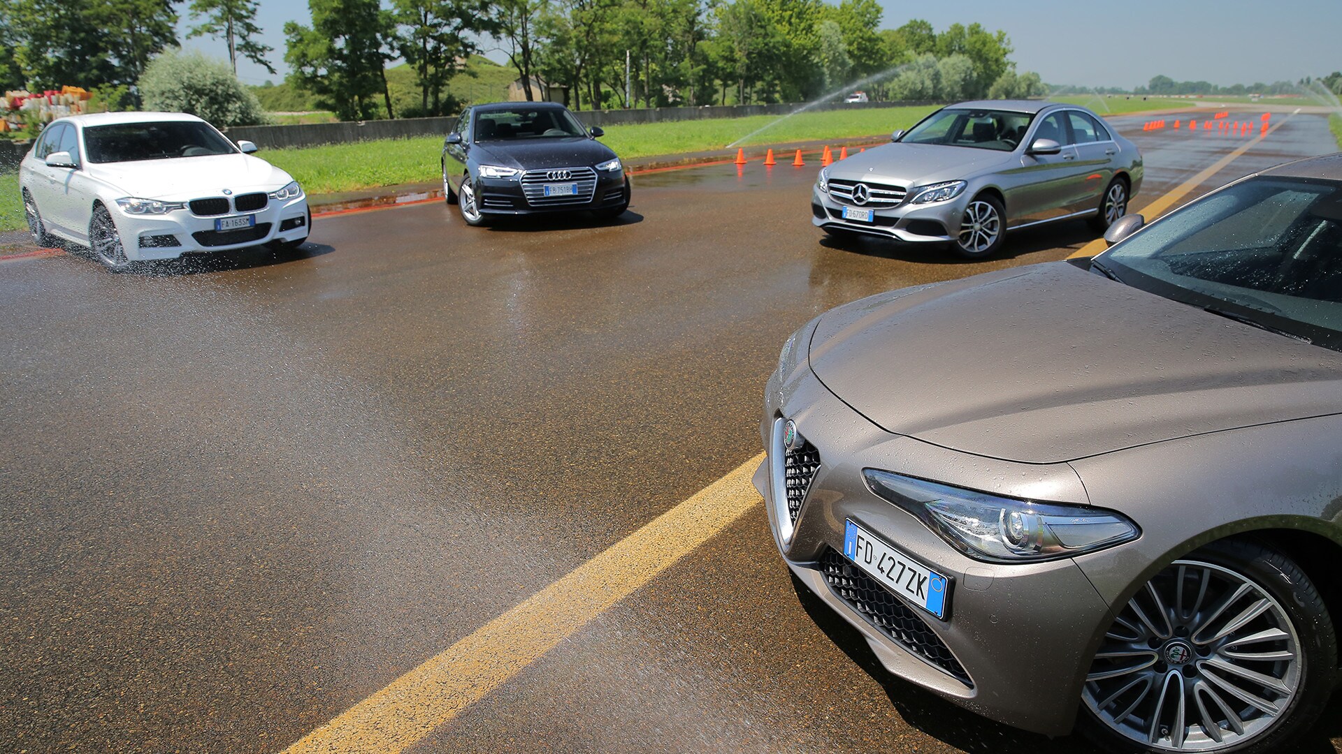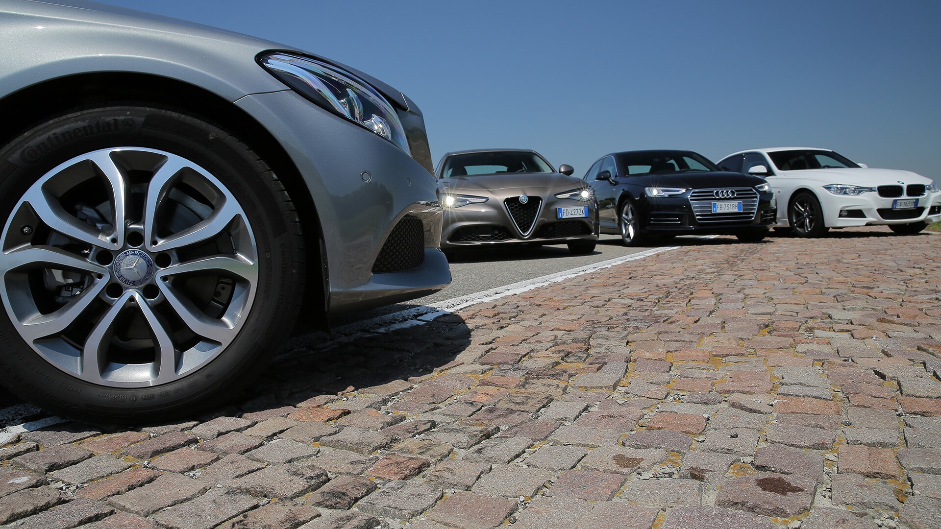 «La soluzione più semplice sarebbe scegliere la solita berlina tedesca»: così recita un passo della pubblicità televisiva della Giulia. In questa frase sono raccolti il senso e il significato della nuova berlina dell'Alfa Romeo: una Casa che per tanto tempo ha lasciato spazio alle concorrenti made in Germany e che oggi, verrebbe da dire finalmente, torna in campo con un modello progettato ex novo proprio per incrinare la leadership renana. La Giulia l'abbiamo provata due mesi fa e il risultato è stato più che lusinghiero. Ma era inevitabile arrivare al test definitivo: il confronto con Audi A4, BMW Serie 3 e Mercedes-Benz Classe C, che del segmento sono regine da anni e che, ognuna per un campo specifico, rappresentano il benchmark a cui riferirsi. Del resto, all'Alfa non negano come i progettisti si siano mossi avendo bene a mente le tre teutoniche di riferimento. Il primo indizio, in questo senso, arriva quando ti siedi: all'Alfa hanno ricalcato le misure tipiche delle rivali, con seduta bassa sul pavimento e un'impostazione che porta naturalmente a guidare con gambe e braccia distese. Insomma, un posto di guida comme il faut, senza dubbio. E la sfida si chiude in sostanziale parità pure quando si passa a considerare l'abitabilità: per tutte il quinto posto è una realtà che va cercata più che altro sulla carta di circolazione. Anche per la Audi, che in questo senso dovrebbe essere favorita dall'impostazione con motore trasversale e trazione anteriore. Dove invece non teme confronti, la A4, è nella finitura. Ciò per cui a Ingolstadt sono famosi da molti decenni è più vero che mai: la scelta dei materiali, la cura nella realizzazione, la predisposizione ad applicarsi con ostinata capacità anche a minuzie che pochi vedono e pochissimi soppesano la pongono un gradino sopra le altre. E, per quanto sia l'Alfa meglio rifinita di sempre, alla fine la Giulia riesce a tenere testa al massimo alla BMW. Un risultato peraltro più che onorevole, innanzitutto perché anche la Serie 3 è ben fatta e poi perché bisogna tenere conto di un aspetto non trascurabile: gli italiani si sono infilati in un comparto dal quale erano assenti da molto tempo, mentre i tedeschi lavorano da decenni (e senza soluzione di continuità) intorno al tema della berlina premium…