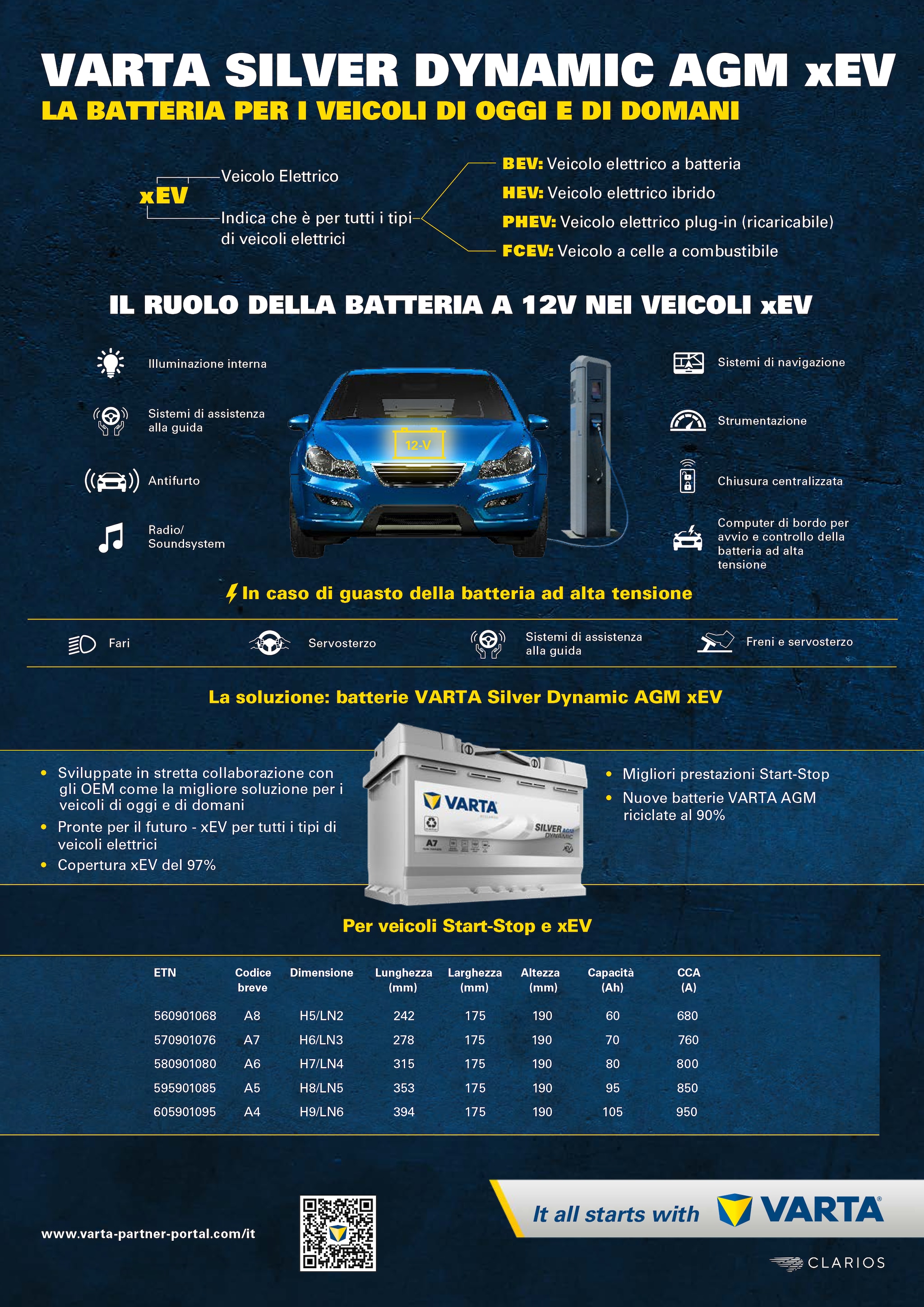 Le batterie a 12V rimangono l'ancora di salvezza per i veicoli elettrici, garantendo avviamenti affidabili e supporto ai sistemi a bassa tensione in tutte le fasi di guida e in situazioni di emergenza. Fungono da fonte di alimentazione ausiliaria per garantire il funzionamento ininterrotto di sistemi critici per la sicurezza, quali ABS e ESP, anche quando la batteria ad alta tensione è fuori uso. Sono anche necessarie per attivare la trasmissione ad alta tensione ed alimentare tutti gli utilizzatori elettrici che devono operare anche con l’accensione disinserita, come ad esempio la chiusura porte centralizzata, i sistemi antifurto e gli aggiornamenti via etere. Grazie alle batterie VARTA con le robuste e affidabili AGM xEV, la sicurezza e l'affidabilità dei veicoli elettrici sono assicurate anche nei momenti critici.Prestazioni superiori con le batterie AGM xev di VARTA