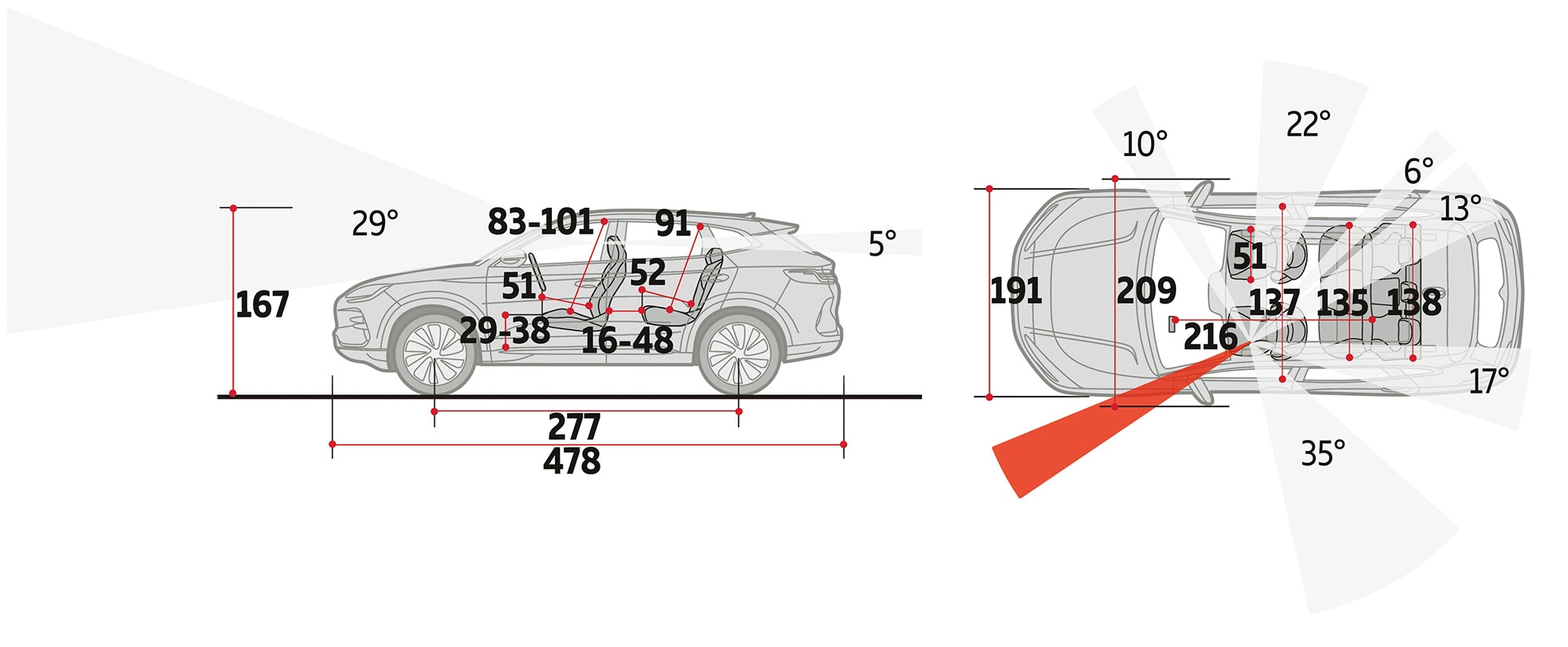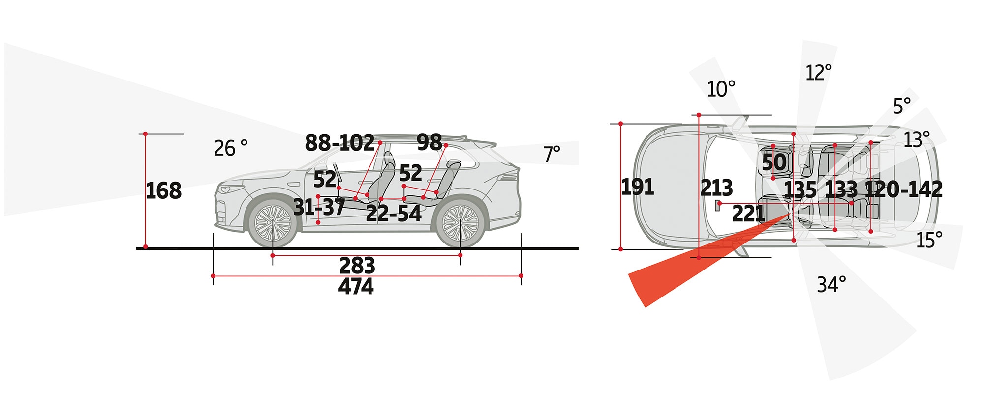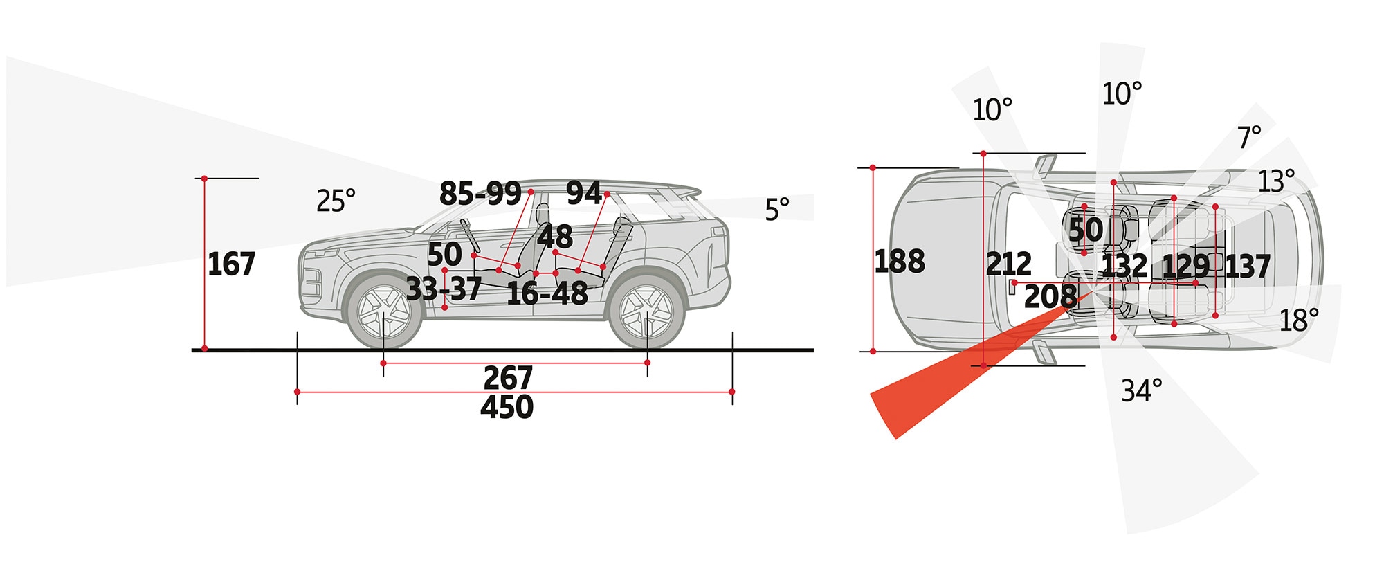 Lunghezza abitacolo | 208 cm In rapporto ai 4,50 metri della vettura, gli interni sono molto spaziosi. |