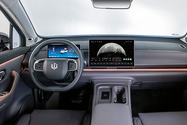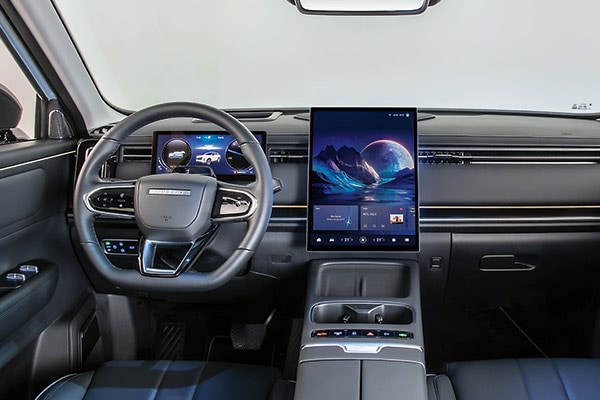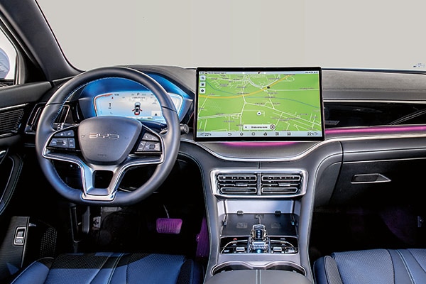 Il cruscotto da 10,3 pollici (a cui è abbinato l'head-up display) ha un'aria posticcia, mentre l'infotainment verticale da 14,6 pollici domina la scena. Fa gestire di tutto, vista la quasi totale assenza di comandi fisici. La leva del cambio al volante libera spazio per la piastra di ricarica (ventilata) da 50 W.